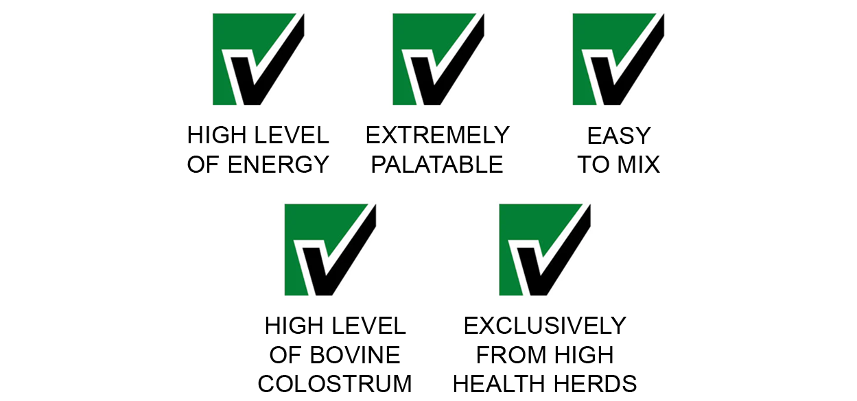 A full-fat colostrum replacer which provides high levels of colostrum proteins and energy to all new-born calves.